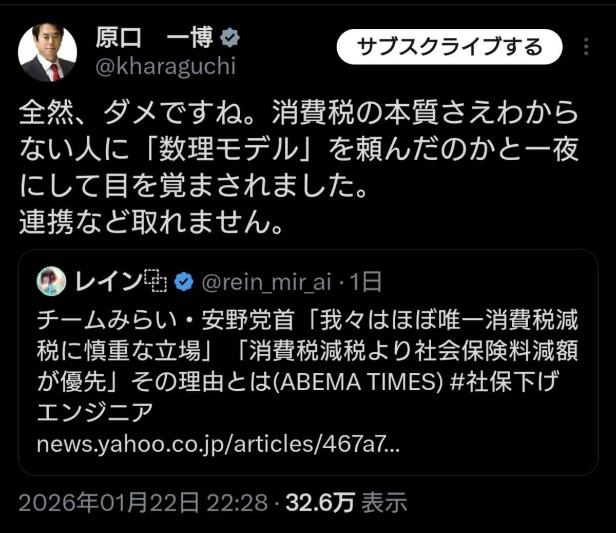 一転、同日夜には、チームみらいや安野氏が消費税減税に慎重姿勢をとっていることを挙げ「全然、ダメですね。消費税の本質さえわからない人に『数理モデル』を頼んだのかと一夜にして目を覚まされました。連携など取れません」とXに投稿。コメント欄には「(イソップ童話の)酸っぱい葡萄ですね 水に写った犬の骨はとれません」「先生、断られたからと言って相手方に失礼ですよ!」「これは、ダサく映るからやめた方がいいですよ 秋波を送ったのに相手にされる事もなく振られ、その相手を腐してプライドを保ったようにしか見えませんw」との指摘が相次いだ。