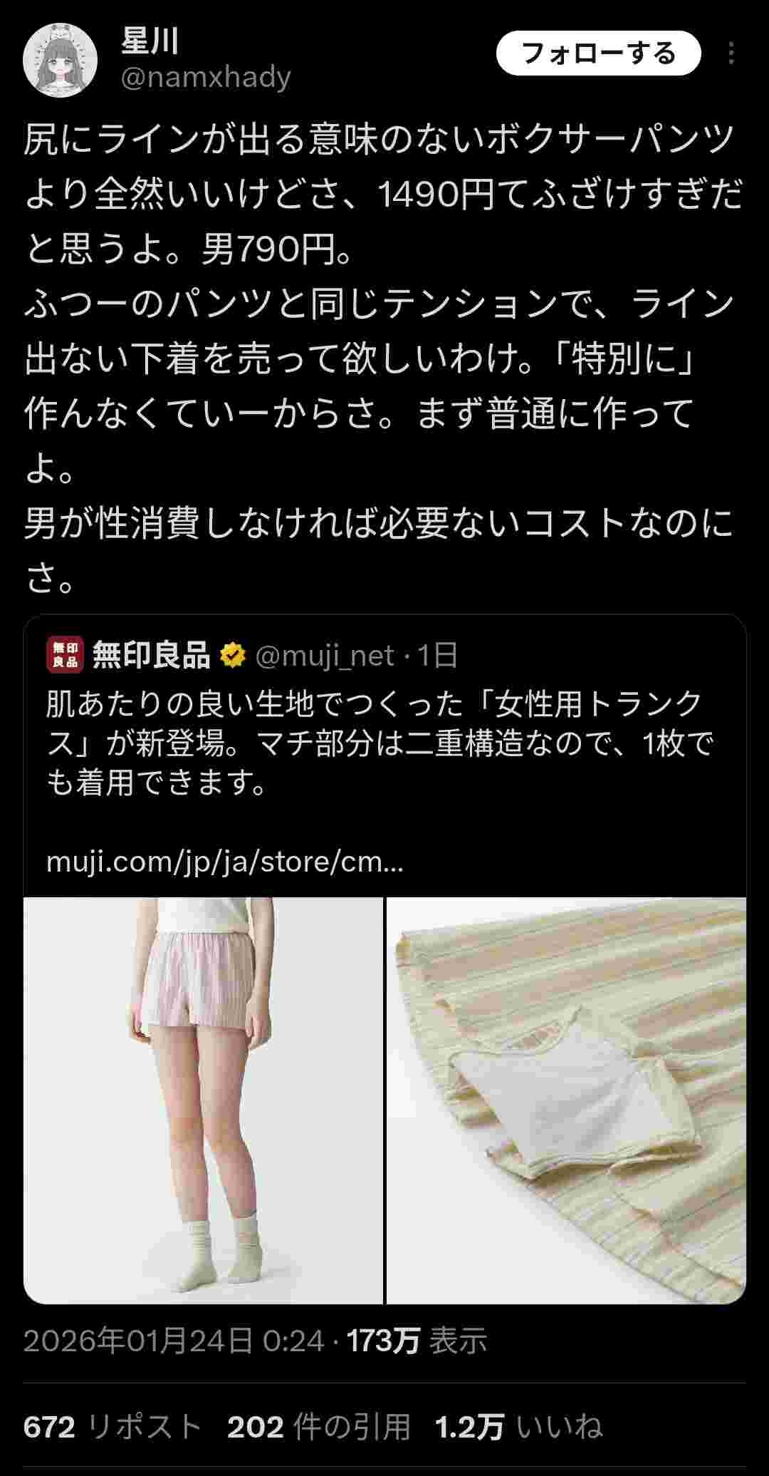 無印良品「女性用のトランクス発売するよ!」→女ブチ切れで大炎上www