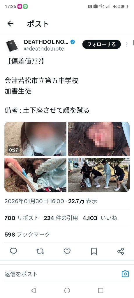 会津若松市立第五中学校の生徒、女の子をレ●プして回した後、顔面に蹴りでボコボコにする動画が出回る