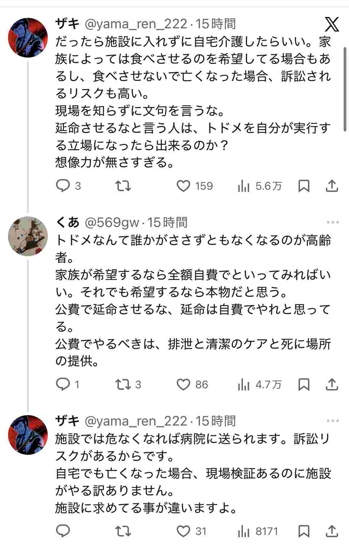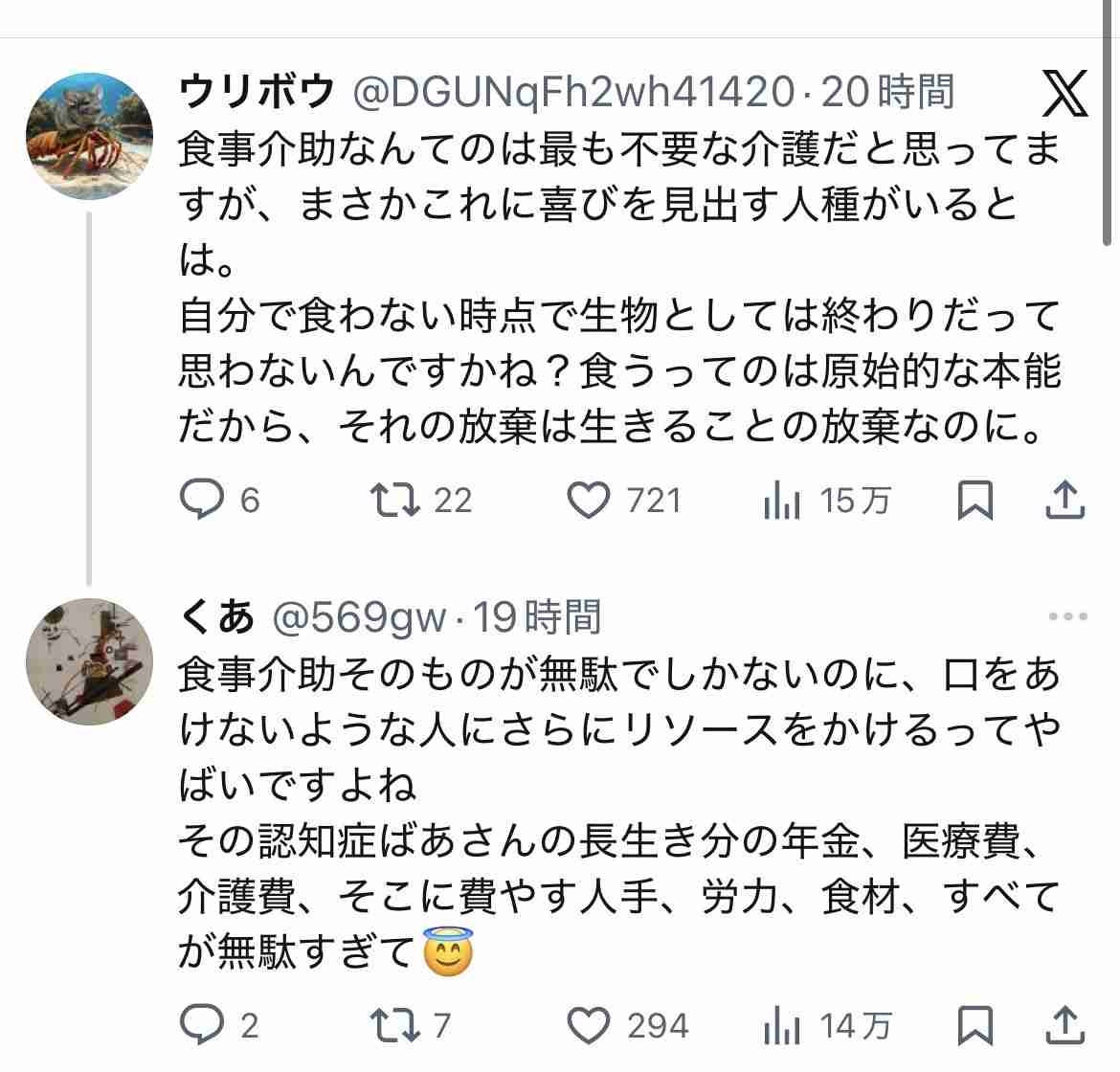 愛国者「食事介助とかすんな寿命だから食えないならそのままにしとけ。必要なのは死に場所。現役世代の足を引っ張ってること気づけよ」