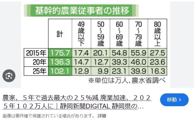 https://news.yahoo.co.jp/articles/497a2cbfdbd421c2b52c26e17e7cda48e0ea5134農林水産省が28日発表した2025年の「農林業センサス」(速報値)によると、