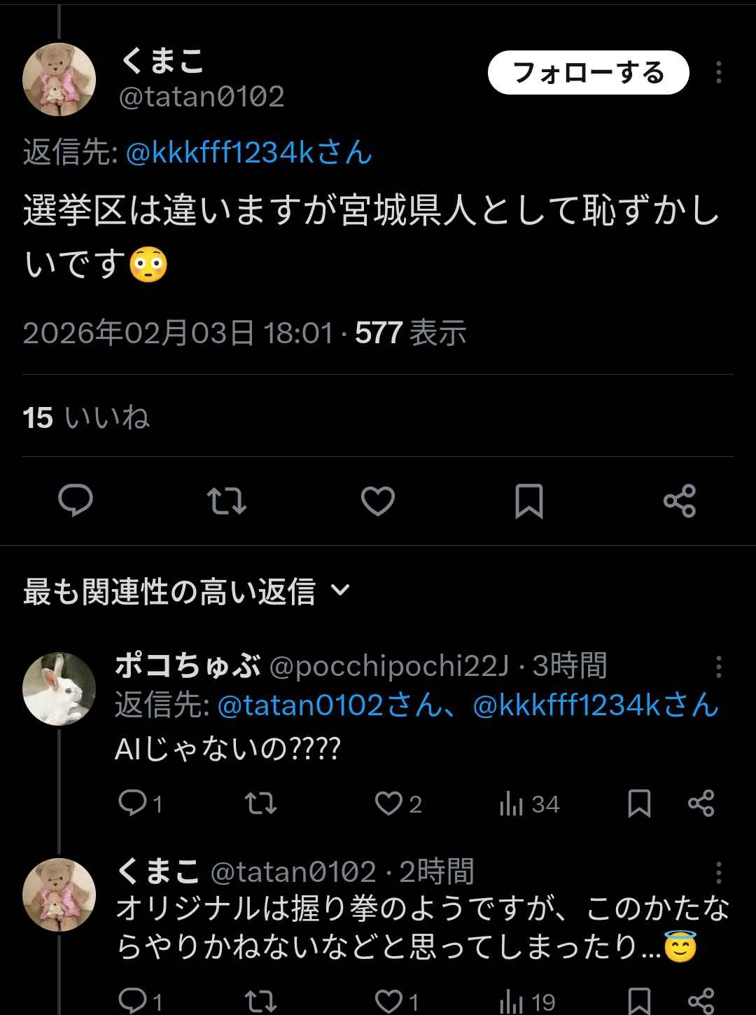 高市も仙台で演説してるし、完全に号令かかってる - 76 名前:ここからは表現の自由でイカせていただきます 投稿日時:2026/02/03(火) 22:41:43.98 ID:4n4Y4xFB0