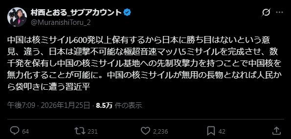 でも今音速ミサイル持ってるの日本じゃなくて中国だよね - 19 名前:ここからは表現の自由でイカせていただきます 投稿日時:2026/02/04(水) 12:37:44.43 ID:IbauWCBU0