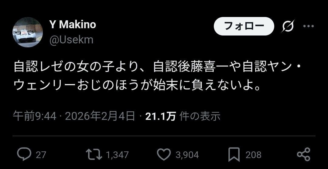 27 名前:ここからは表現の自由でイカせていただきます 投稿日時:2026/02/04(水) 18:54:00.98 ID:QtI9hxMfd