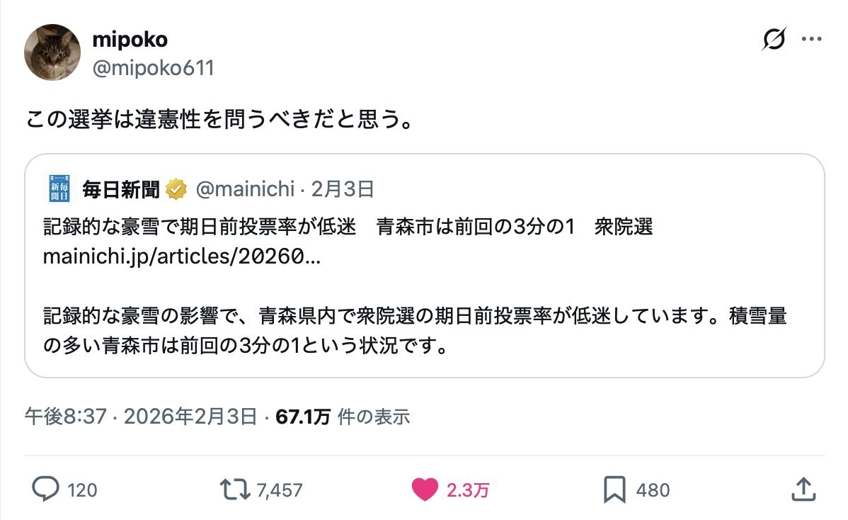 【高市選挙】記録的な豪雪で期日前投票率が低迷。「この選挙は違憲性を問うべきだ」という意見に2.3万いいね