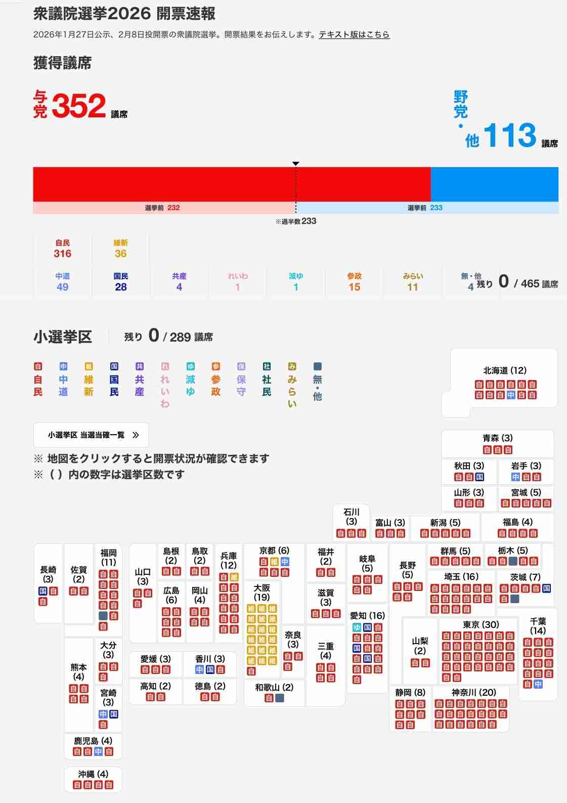 衆議院選挙速報2026 開票速報・選挙結果・出口調査 -衆院選- NHK【NHK】衆議院選挙2026特設サイトでは、投開票日の2月8日20時から開票速報、出口調査や、各選挙区・比例代表の議席数を速報でお知らせします。news.web.nhk - 2 名前:ここからは表現の自由でイカせていただきます 投稿日時:2026/02/09(月) 18:32:00.71 ID:d9GYbq8r0
