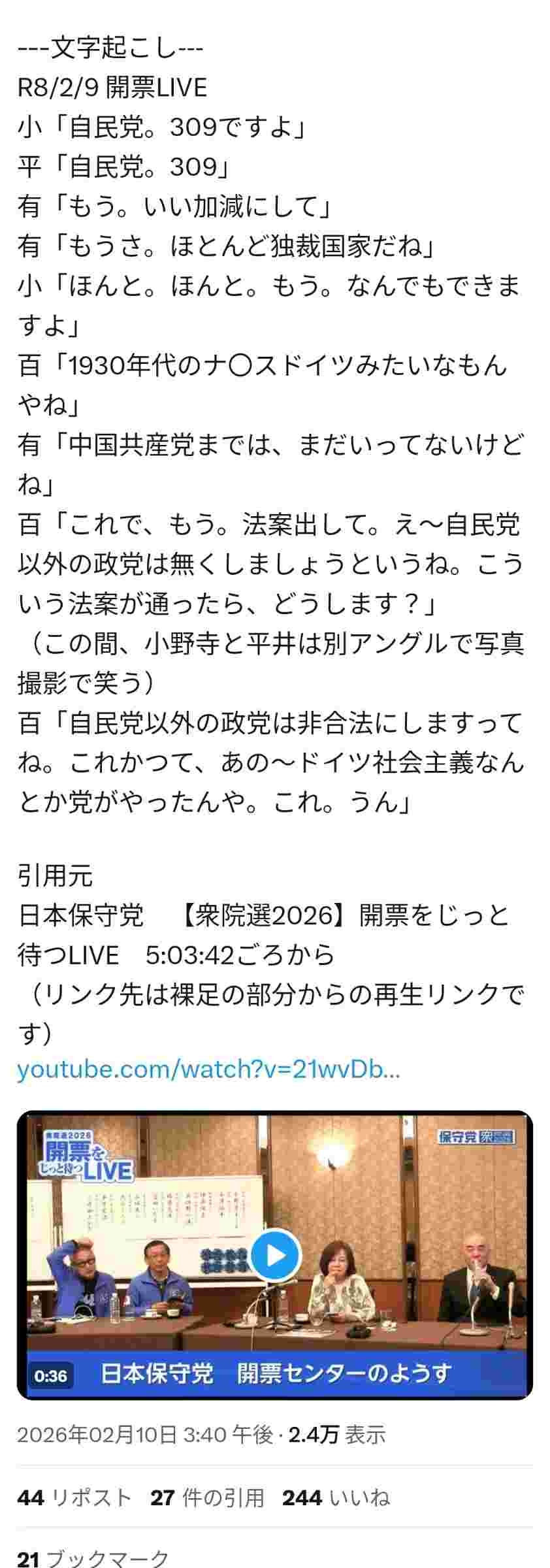 ほんとは330議席だったわけでしょ - 23 名前:ここからは表現の自由でイカせていただきます 投稿日時:2026/02/10(火) 20:07:17.03 ID:MNi14o8w0