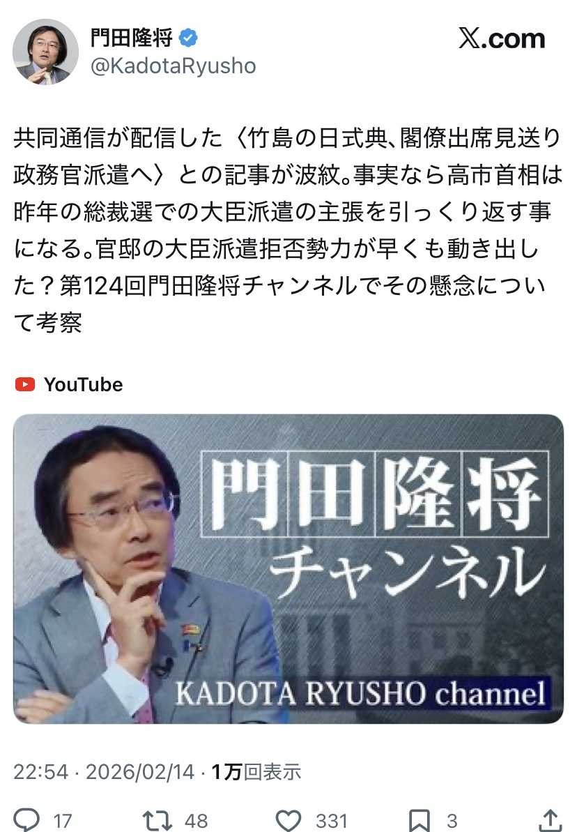 高市首相「竹島の日」巡る「堂々と大臣が」発言が拡散し賛否殺到 「閣僚出席見送る方向」報道で(日刊スポーツ) - Yahoo!ニュース島根県などが22日に松江市で開く「竹島の日」式典への閣僚出席有無を巡る報道をうけ、SNS上では高市早苗首相(自民党総裁)の昨年の発言との”違い“を指摘する声が相次ぎ、さまざまな論議を呼んでいる。news.yahoo.co.jp - 2 名前:ここからは表現の自由でイカせていただきます 投稿日時:2026/02/15(日) 05:12:21.23 ID:fb9ygHPg0