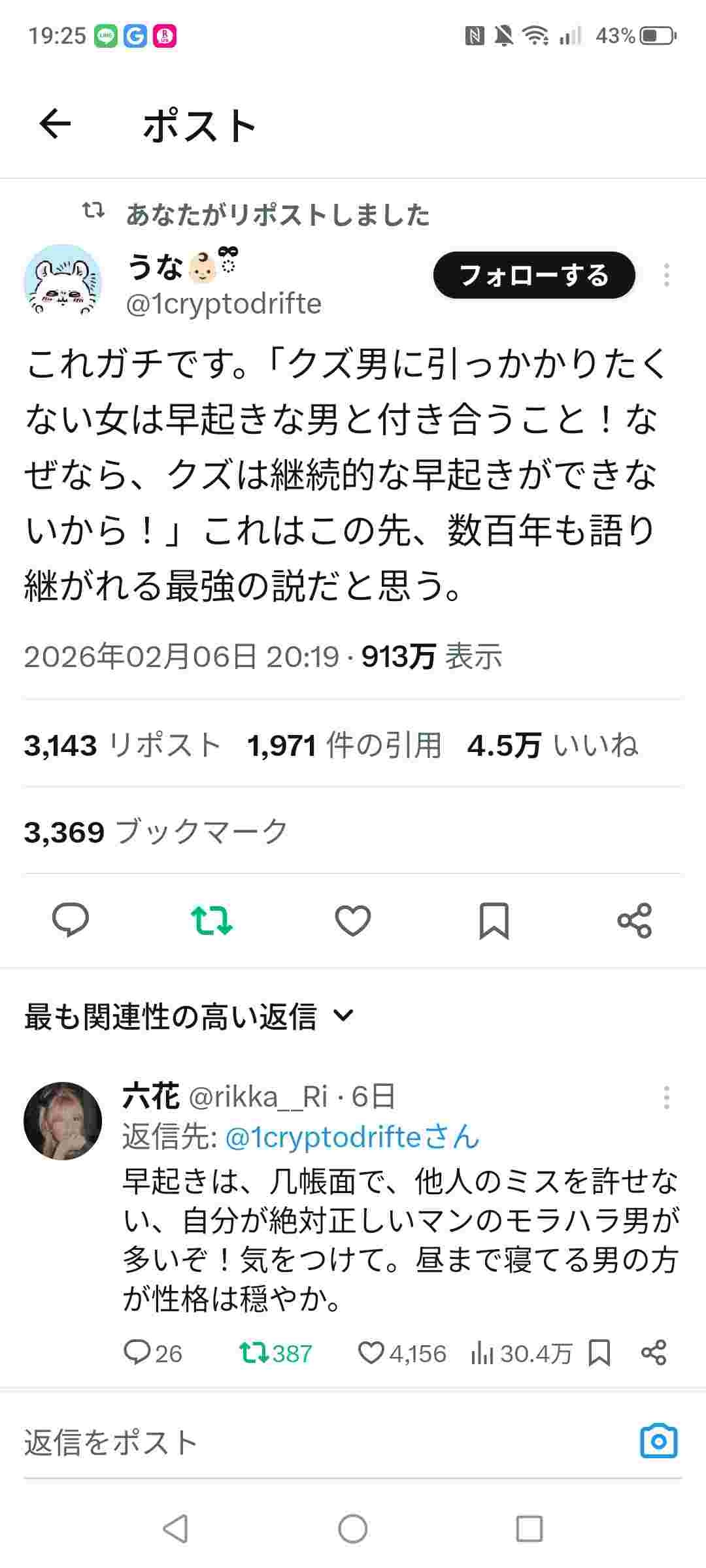 早起き男はモラハラや - 18 名前:ここからは表現の自由でイカせていただきます 投稿日時:2026/02/15(日) 20:29:55.98 ID:h3tfwen20