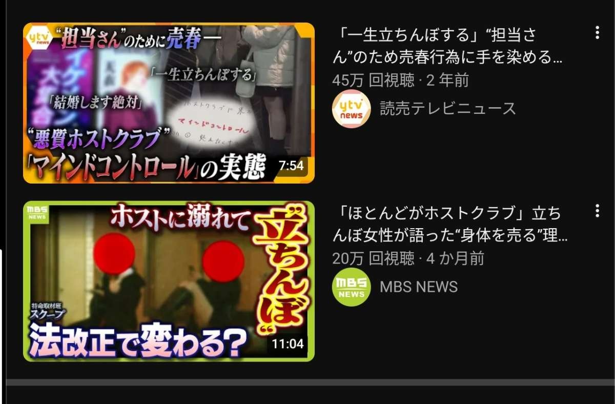 「ほとんどがホストクラブ」立ちんぼ女性が語った“身体を売る”理由 「色恋営業禁止」法改正でホストクラブに変化? 客とホストたちの本音【スクープ】【MBSニュース特集】(2025年9月25日)大阪の歓楽街で横行する路上売春。なぜ身体を売ってまでお金を稼ぐのか、取材をすると、ホストクラブなどにのめり込む女性たちの姿が見えてきました。そしてこうした事態を受けて、ホストクラブなどでは法改正による規制が強化され、いま大きな変化を求められています。その実情を取材しました。(2025年9月25日放送 MBSテレビ...www.youtube.com - 2 名前:ここからは表現の自由でイカせていただきます 投稿日時:2026/02/15(日) 14:39:50.37 ID:GKB6i9vCH
