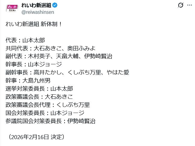 れいわ新選組が新体制を発表!代表:山本太郎、共同代表:大石あきこ、奥田ふみよ、幹事長:山本ジョージ