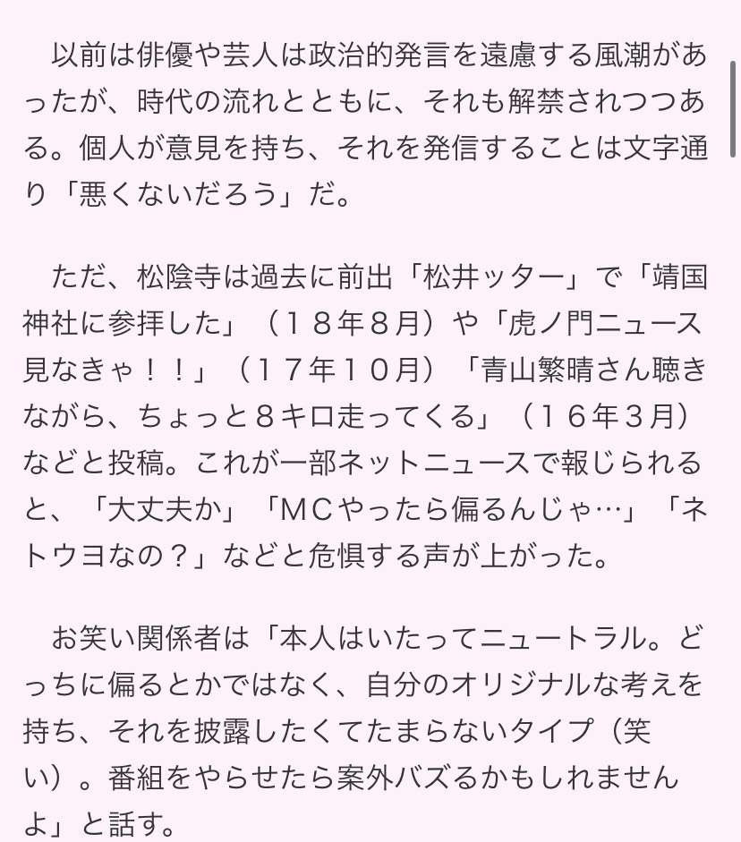 ただ、松陰寺は過去に前出「松井ッター」で「靖国神社に参拝した」(18年8月)や「虎の門ニュース見なきゃ!!」(17年10月)「青山繁晴さん聴きながら、ちょっと8キロ走ってくる」(16年3月)などと投稿。これが一部ネットニュースで報じられると、「大丈夫か」「MCやったら偏るんじゃ…」「ネトウヨなの?」などと危惧する声が上がった。