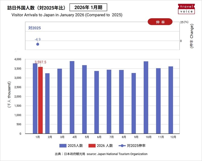 日本政府観光局(JNTO)が発表した2026年1月の訪日外国人旅行者数(推計値)は、前年比4.9%減の359万7500人となった(2025年1月は378万1629人)。2022年1月以来、4年ぶりに