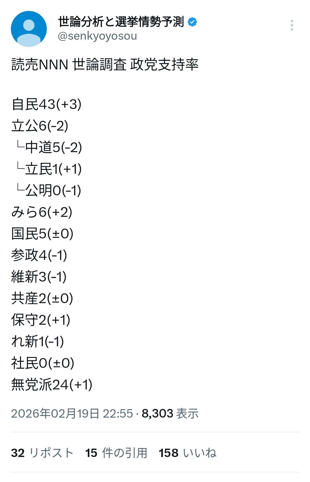 政党支持率、チームみらいが中道に並び野党筆頭