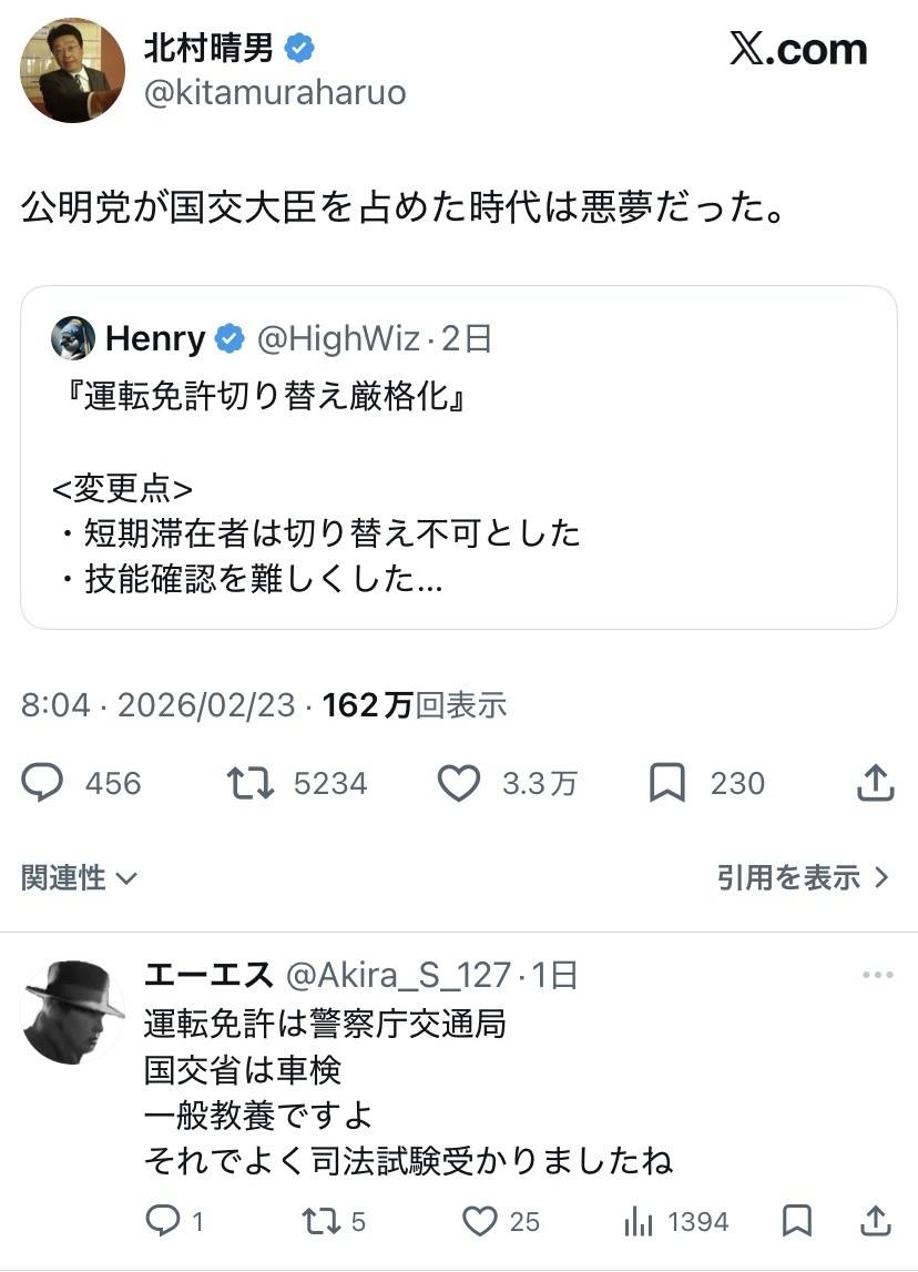 自公連立政権時代、国交大臣のポストは公明党の「指定席」だった。厳格化前の外免切替制度と公明党が関係しているかのように読める北村氏の投稿だが、これをめぐって、Xでは他のユーザーからこんな批判が続出した。