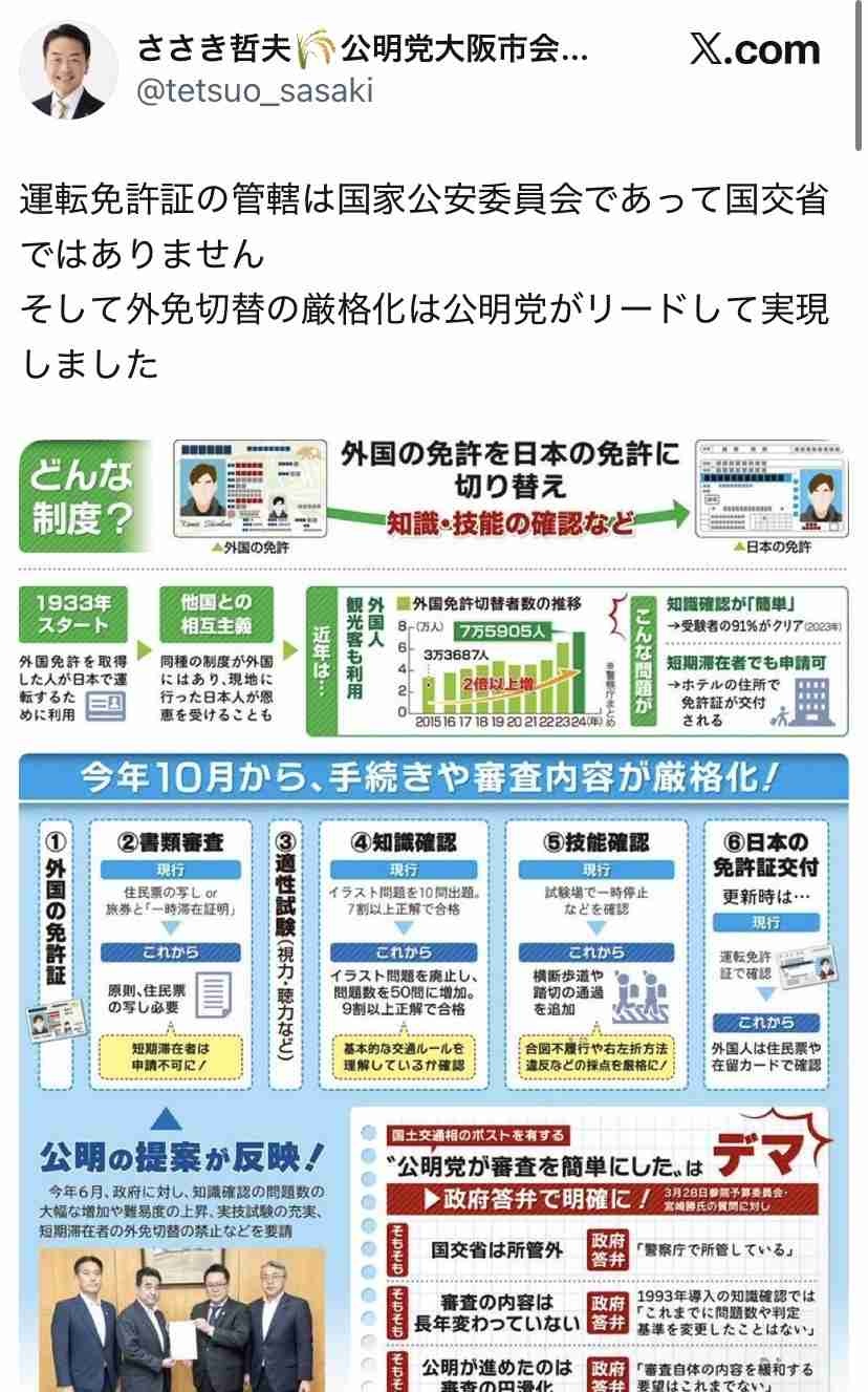 「多くの指摘が上がっているように、自動車運転免許の管轄は国交省ではなく公安委員会(警察)ですし、外免切替も同じです。北村氏がどのような意図で外免切替厳格化後にテストの合格率が下がったという投稿に対し、公明党に国交省ポストが割り当てられてきた事実を繋げたのかはわかりませんが、同党は切り替え時のテストの問題数を増やすことや、短期滞在者の切替禁止など、むしろ厳格化を政府に要請してきた立場。その内容が新制度にも反映されています。また、厳格化前の10問のテスト形式は’93年に導入されており、当時の公明党は自民党と連立を組んですらいません」(政治部記者)