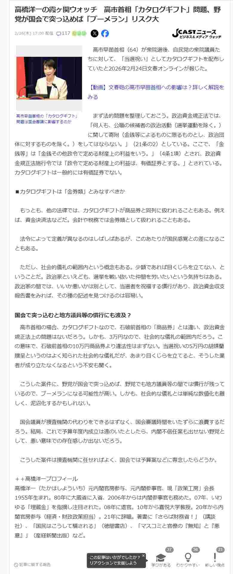 高橋洋一「高市のカタログギフトは有価証券ではない社会的儀礼、石破の商品券はアウツ、野党はブーメランリスクで追及はできない