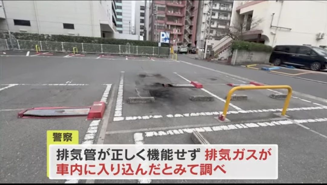 駐車場や車体には黒いすすがついていて、警察は車内に排気ガスが入り込んだとみて、当時の状況や原因などを調べています。