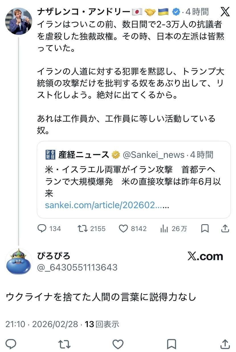 ナザレンコ・アンドリー「イランの人道犯罪を黙認しトランプだけ叩く連中をリスト化すべき」
