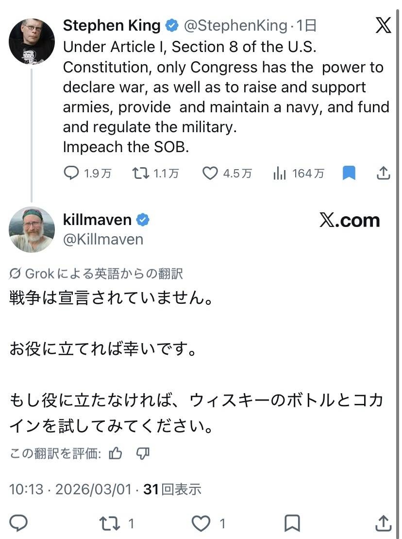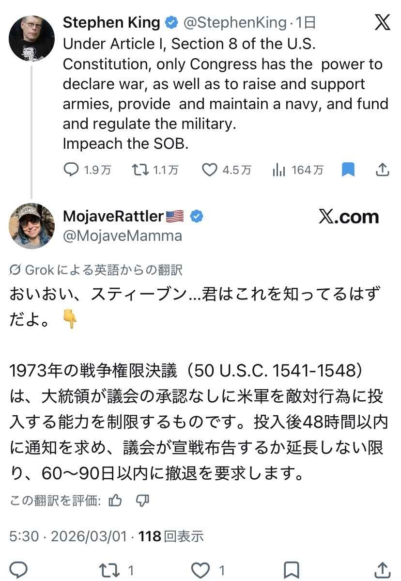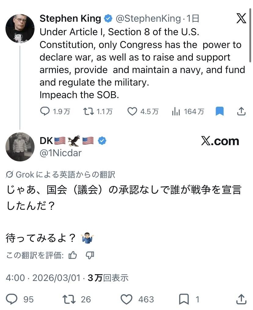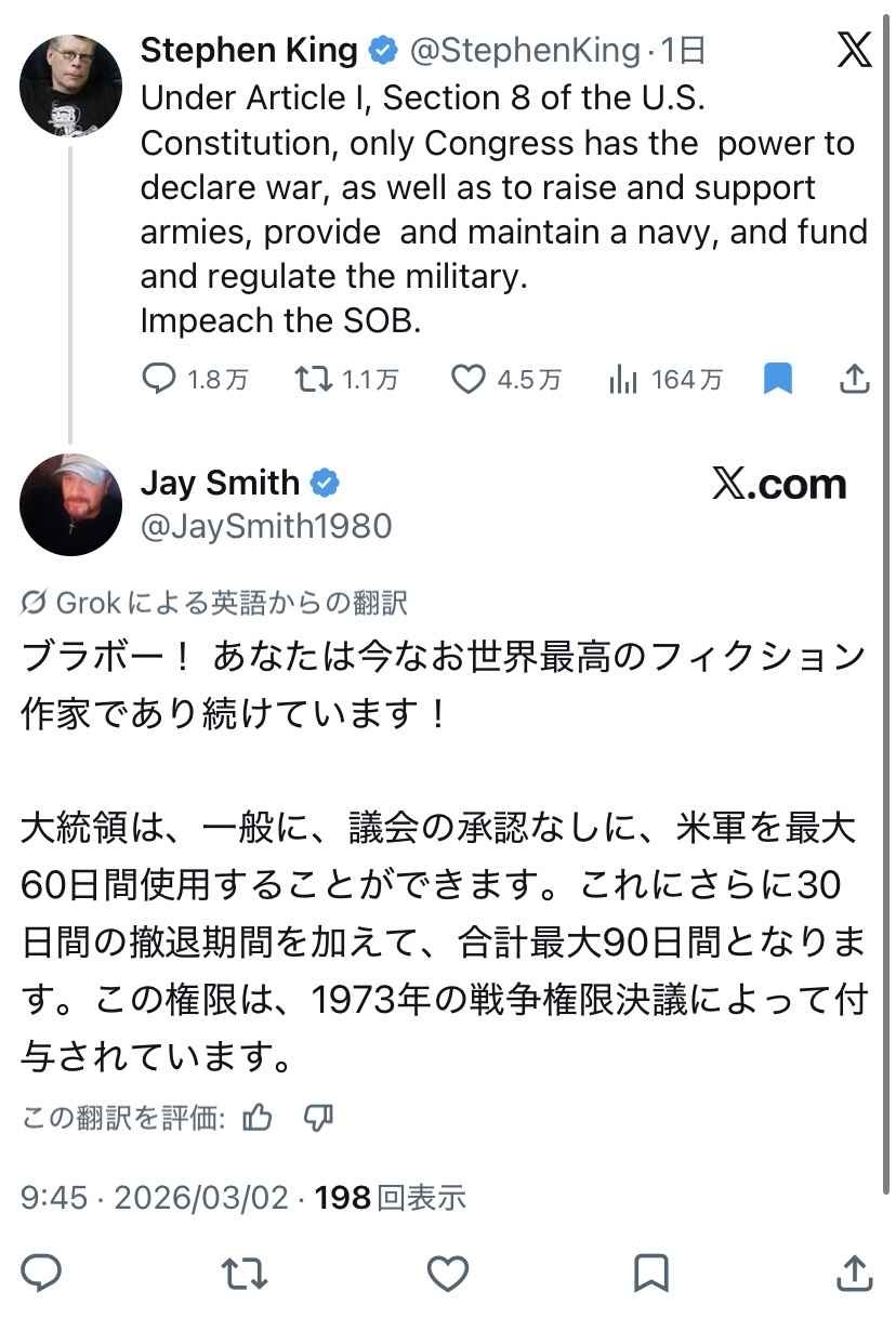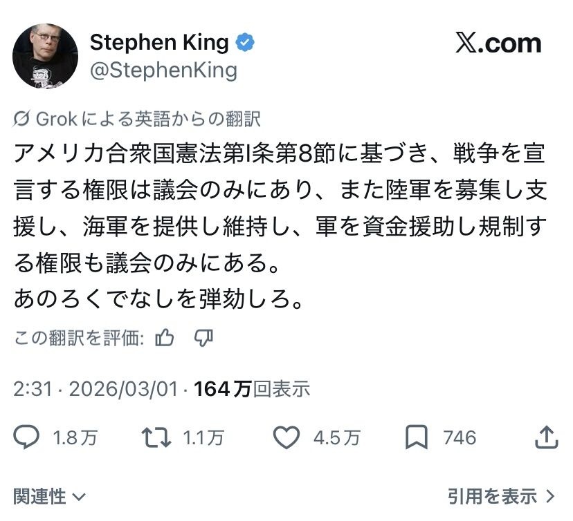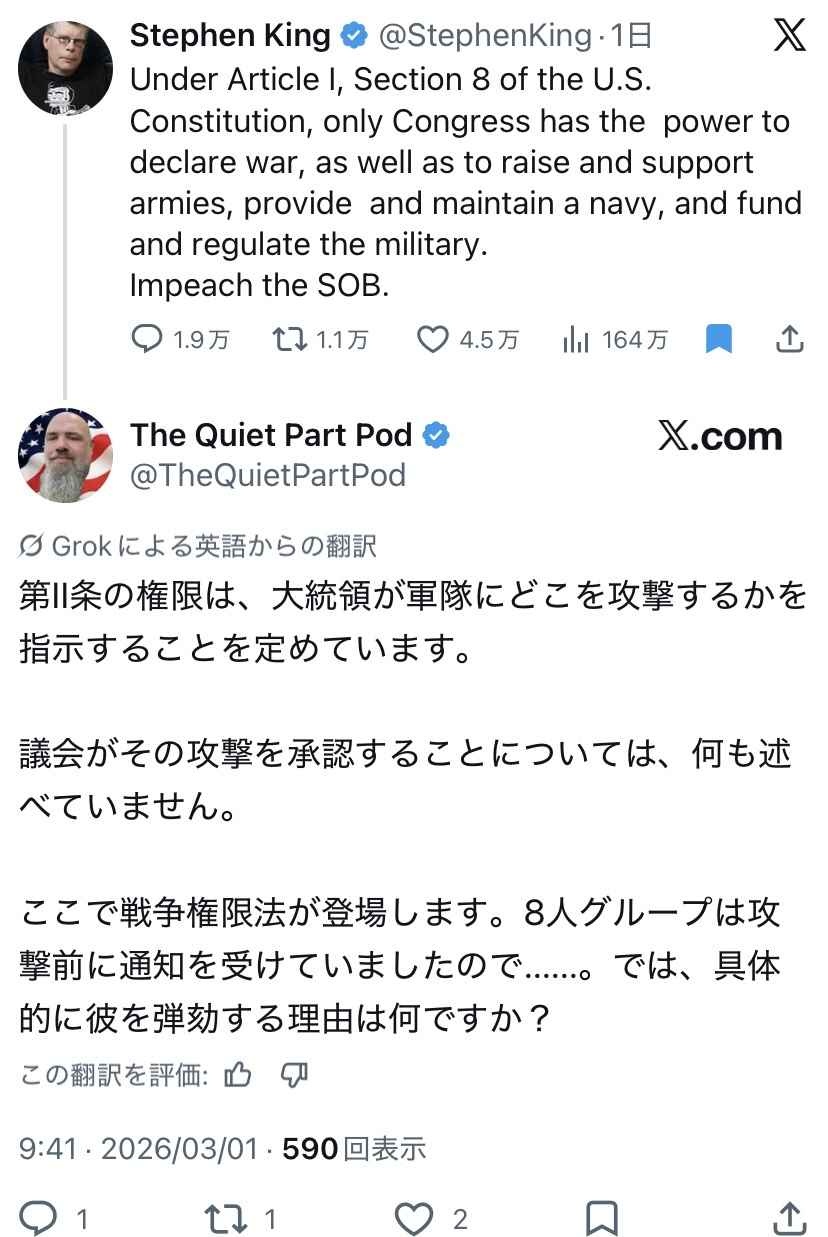弾劾しろ、この野郎(Impeach the SOB)。」このツイートは、トランプ政権の一方的な軍事行動を憲法の規定に照らして強く批判し、必要なら弾劾すべきだというキングの立場を示しています。