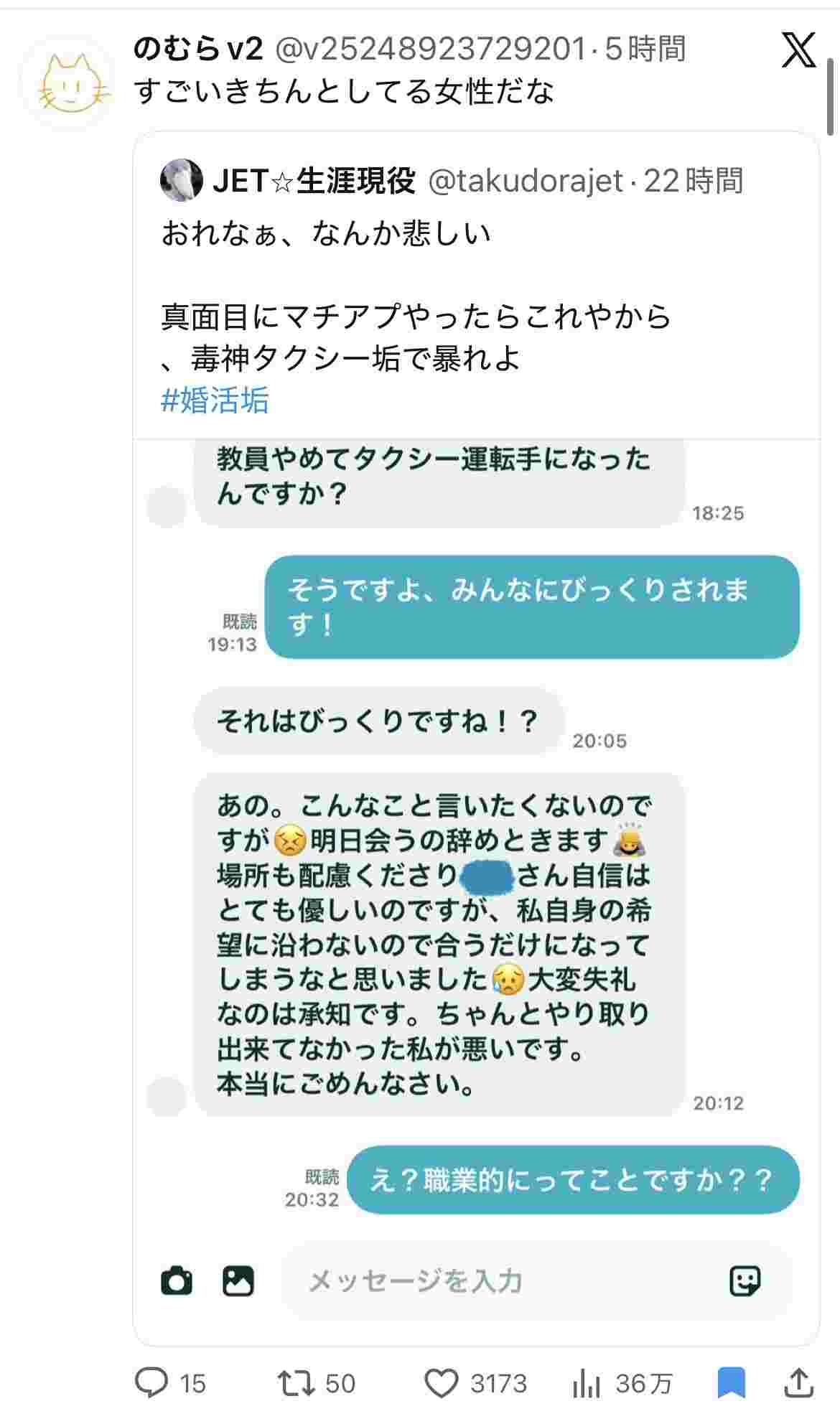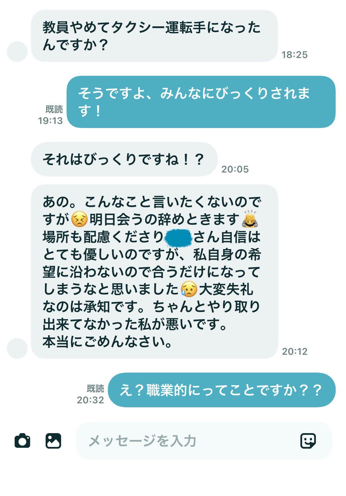 男性「教員やめてタクシー運転手になったんですよ」マチアプ女性「えぇ!?それはびっくりですね!お会いするのやめときます!」