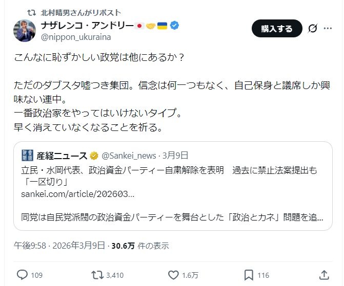 ナザレンコ「こんなに恥ずかしい政党は他にあるか?ただのダブスタ嘘つき集団」立民、政治資金パーティー自粛解除を表明