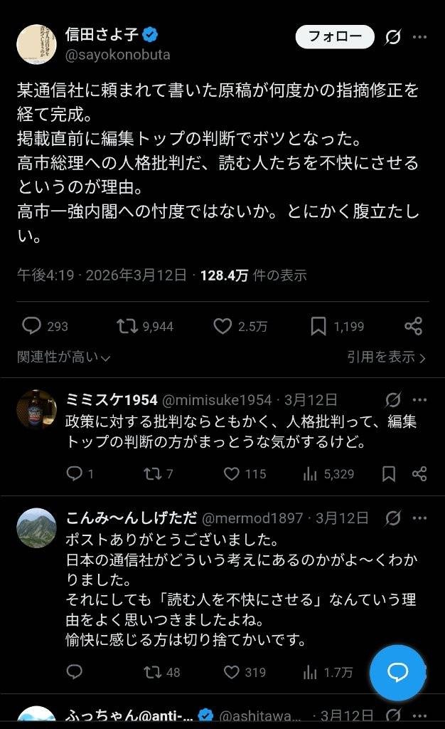 「某通信社に頼まれて書いた原稿が編集トップの判断でボツとなった。高市総理への人格批判だ、読む人たちを不快にさせるからと😲