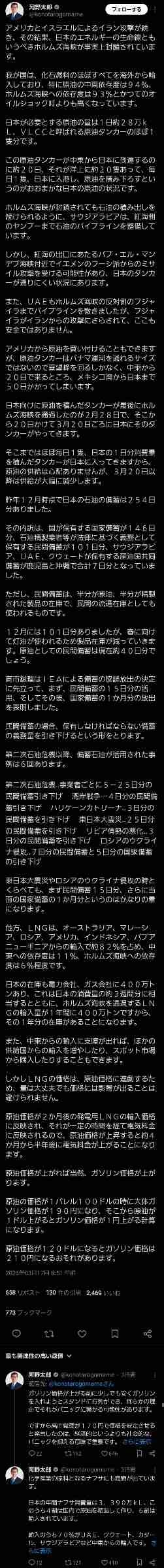 自民党議員「高市早苗の放出で石油備蓄はほとんどなくなった」👈この状況でホルムズ海峡護衛に反対するやつはテロリストだろ