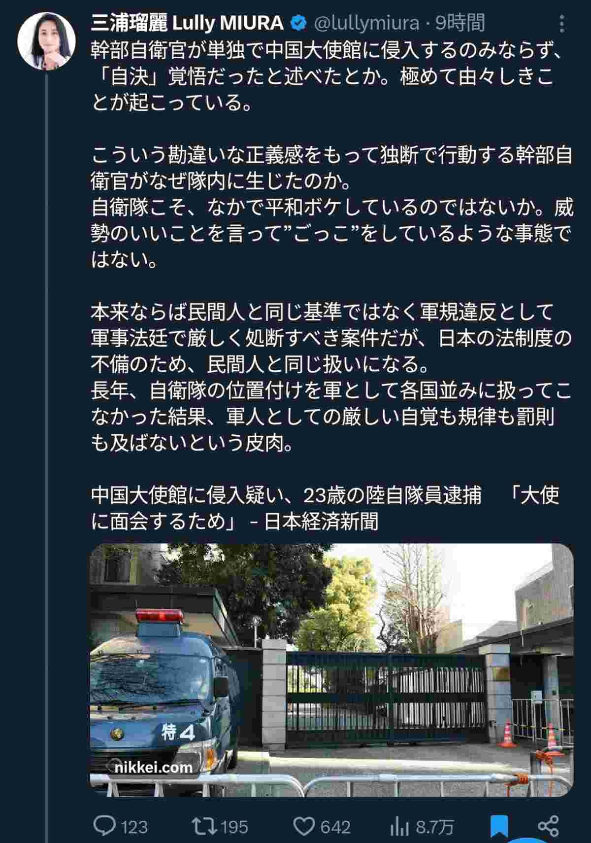 三浦瑠麗さん、ウヨ自衛官中国大使館襲撃事件にお気持ち表明 「これは自衛隊が平和ボケしてたから起こった事件なの!」