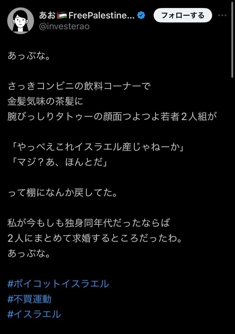 まんさん「金髪タトゥーな若者がコンビニで『っべ!これイスラエル産だ』って飲み物ボイコットしてて求婚しかけましたw🙋」