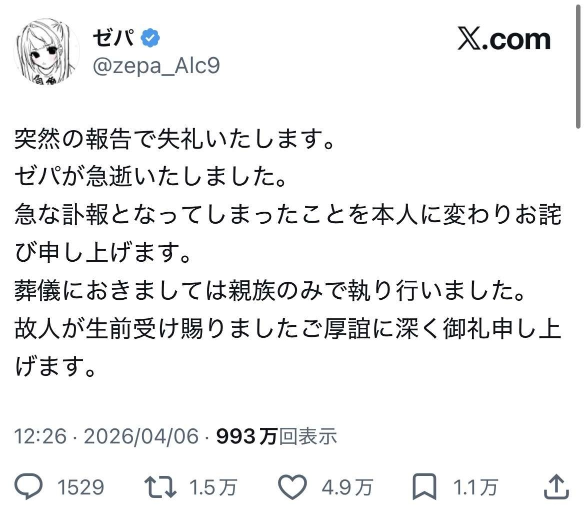 【訃報】お酒大好き系大人気女性YouTuber「ゼパちゃん」、お亡くなりになられる