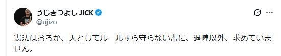 うじきつよし「憲法はおろか、人としてルールすら守らない輩に、退陣以外、求めていません」