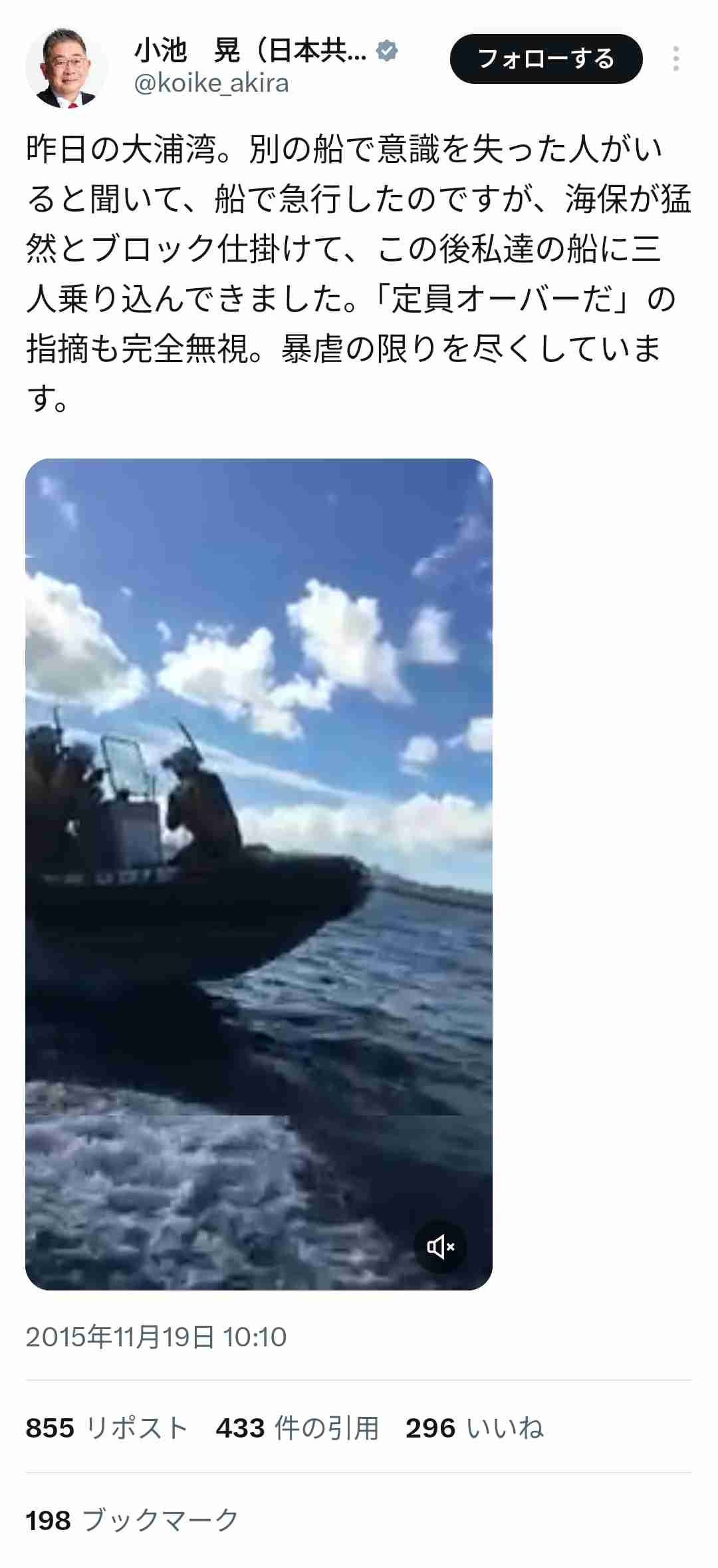 共産小池、抗議船に乗って海保とバトル「国会議員に逆らうな!!」