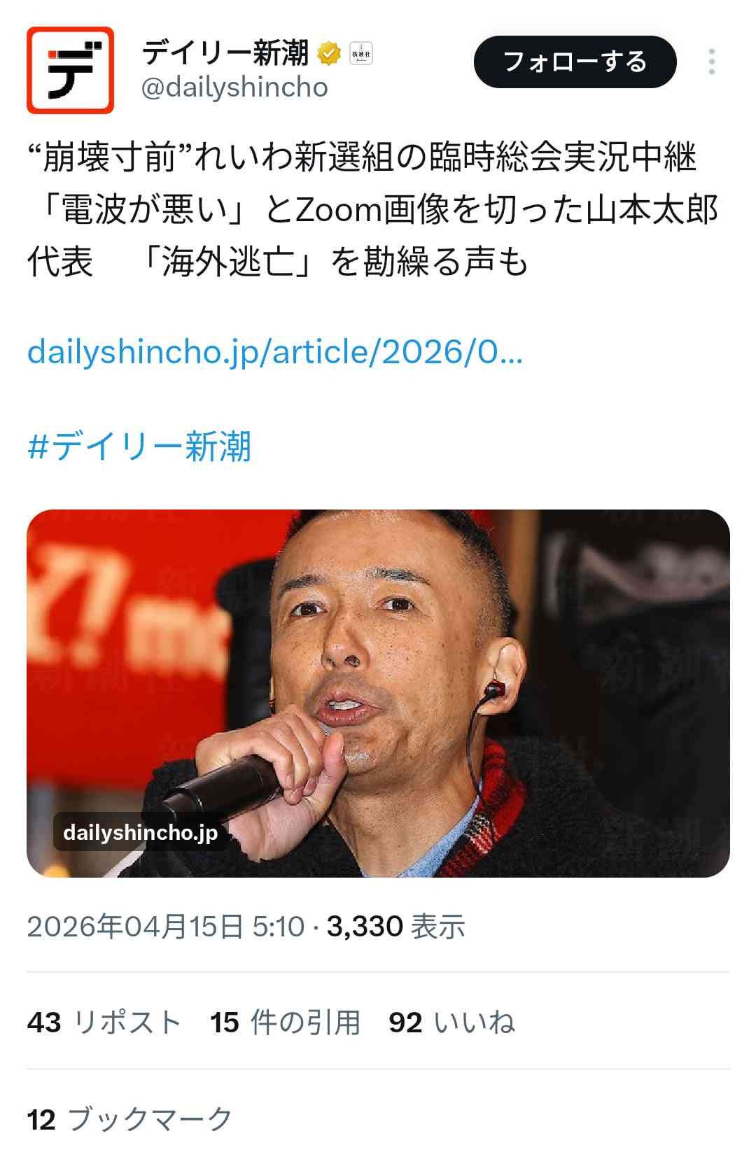 同じれいわ議員達が太郎とヒス女の身勝手で独りよがりな言動を攻撃してるヤバさ - 35 名前:ここからは表現の自由でイカせていただきます 投稿日時:2026/04/15(水) 08:02:57.31 ID:v7TBGgXda