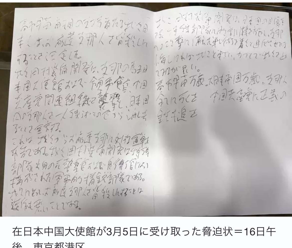 【高市画像】ネトウヨが中国大使館に送った脅迫状www
