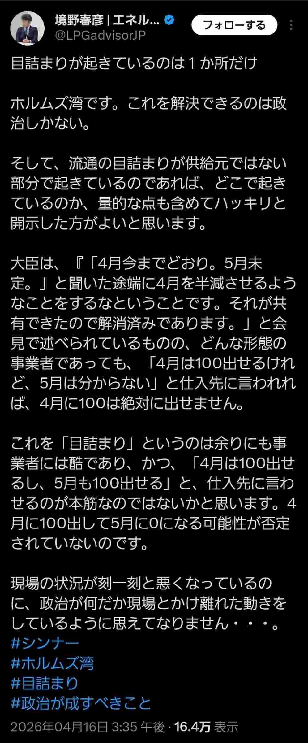 目詰まりが起きているのは1か所だけ ホルムズ湾です。これを解決できるのは政治しかない。 そして、流通の目詰まりが供給元ではない部分で起きているのであれば、どこで起きているのか、量的な点も含めてハッキリと開示した方がよいと思います。
