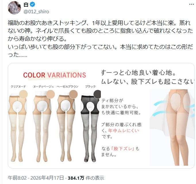 【パンティ部レス ストッキング】が大人気「夏に最適」「蒸れない」「快適」 - 2 名前:ここからは表現の自由でイカせていただきます 投稿日時:2026/04/18(土) 22:58:06.55 ID:uGF+1ESn0