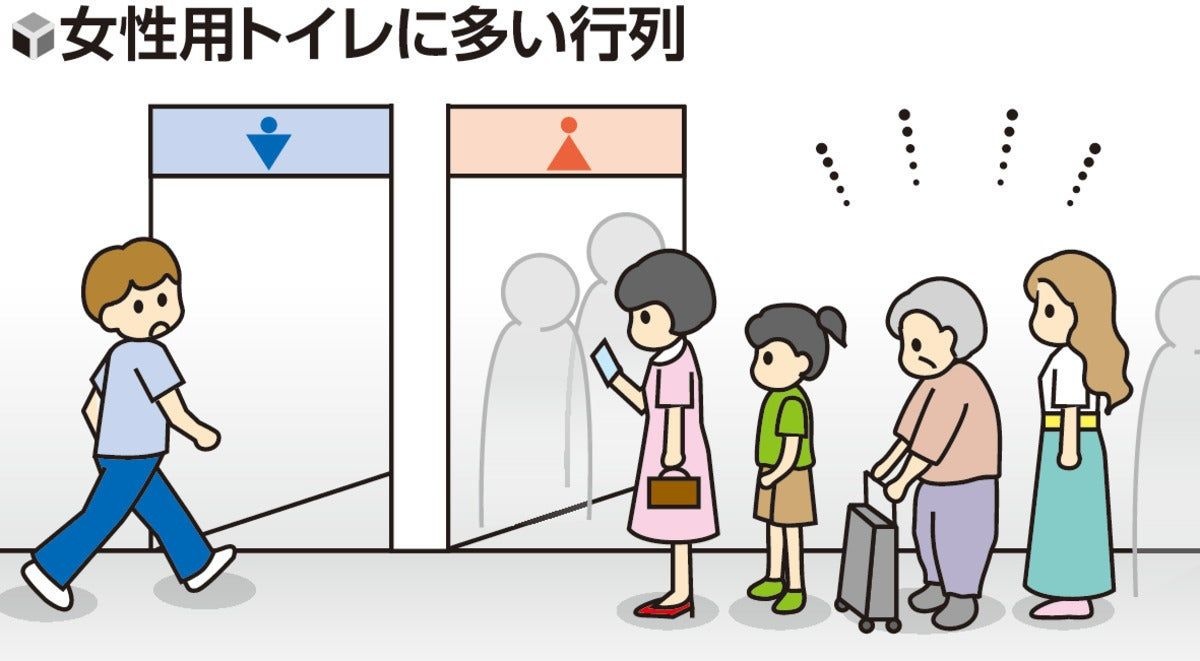 百貨店・量販店におけるトイレの平均占有時間の目安は、男性30秒(個室は240秒)、女性90秒で、衣服の着脱に時間がかかる女性のほうが長い。一方で多くの施設で女性用の便器数は男性用より少ない。