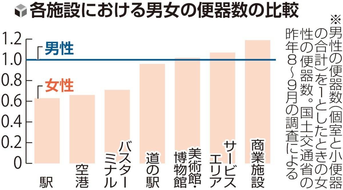 国土交通省が昨年8~9月、11種類の施設約420か所で行った調査では、駅では男性用1に対して女性用は0・63しかないなど、7種類の施設で女性用が男性用を下回った。 - 5 名前:ここからは表現の自由でイカせていただきます 投稿日時:2026/04/19(日) 10:48:31.57 ID:ubO+0NVF0