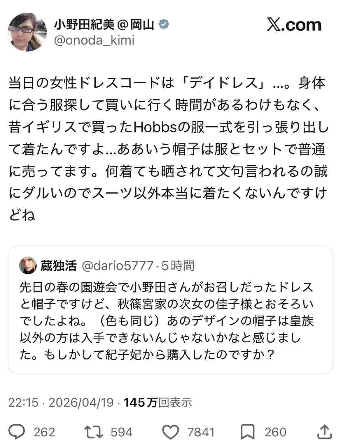 それで、たまたま同じく真似した佳子様と被っただけ - 48 名前:ここからは表現の自由でイカせていただきます 投稿日時:2026/04/19(日) 23:48:27.71 ID:RFIDiTzw0