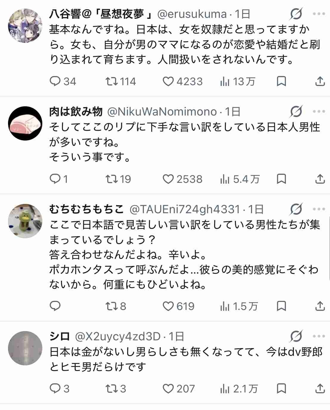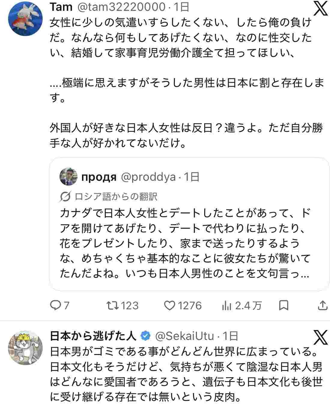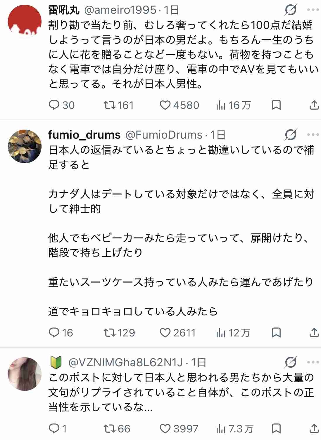 外国人男性「日本人女性はごく普通のことをしてあげただけで物凄く感謝してくれる。日本男性は虐待しかしないからだ」10万いいね