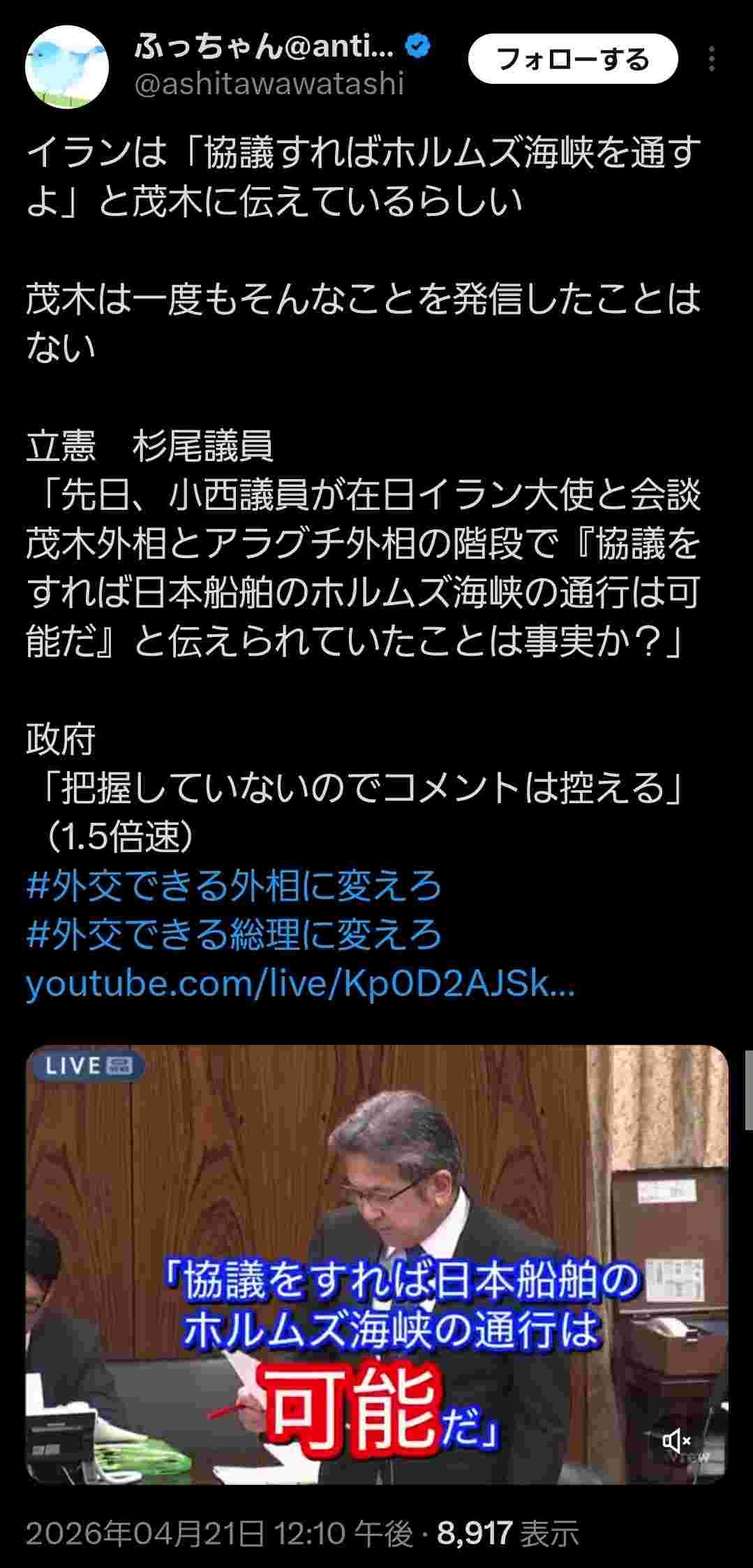 野党「協議すれば海峡を通すってイラン大使は茂木に伝えてるらしいが?」茂木「…ノーコメント😤」