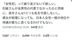 エッヂ フェミさん「高市は私を1mmも代表してないので、女性初のか繰り返さないでほしい」→3.2万いいねの大共感!!