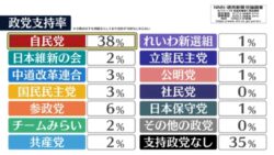 【政党支持率】参政党:6%、国民民主党:3%、中道改革連合:3%、共産党:2%、チーみら:2%、立憲民主党:1%