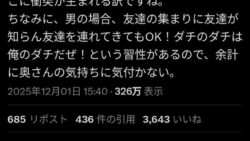 嫌儲 男「結婚したら友達や後輩を勝手に家に呼ぶでしょ?あれ男にとっては身内だから。身内は飯食わして泊めるでしょ」→大炎上