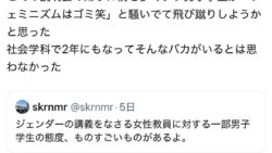 嫌儲 女の子「社会学科2年の男達が『フェミニズムはゴミ(笑)』と騒いでて飛び蹴りしようと思った。そんなバカがいると思わなかった」