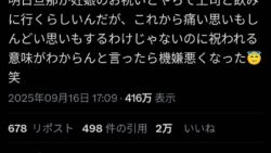 嫌儲 まんさん「旦那に妊娠つげたら上司にお祝いで呑み誘われたっていうからなんでお前が祝われるんだって論破しました🙎」
