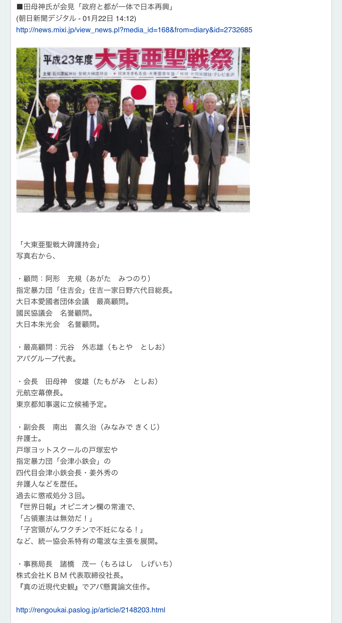 石川県は、護国神社で「大東亜聖戦祭」という行事を毎日開催し、田母神を呼んでいる。馳知事も出席している