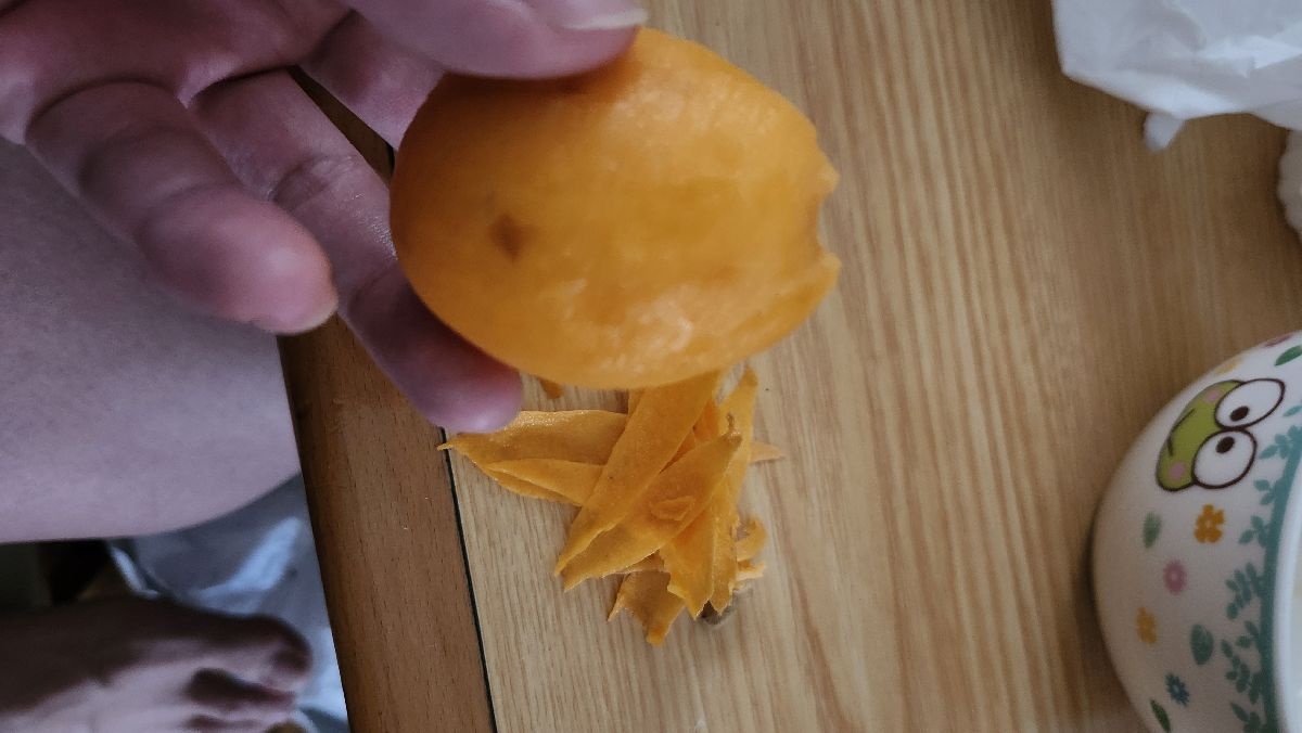 - どっちかの頂点から剥くと花びらみたいに綺麗に剥ける。剥けないときは反対からやり直せ