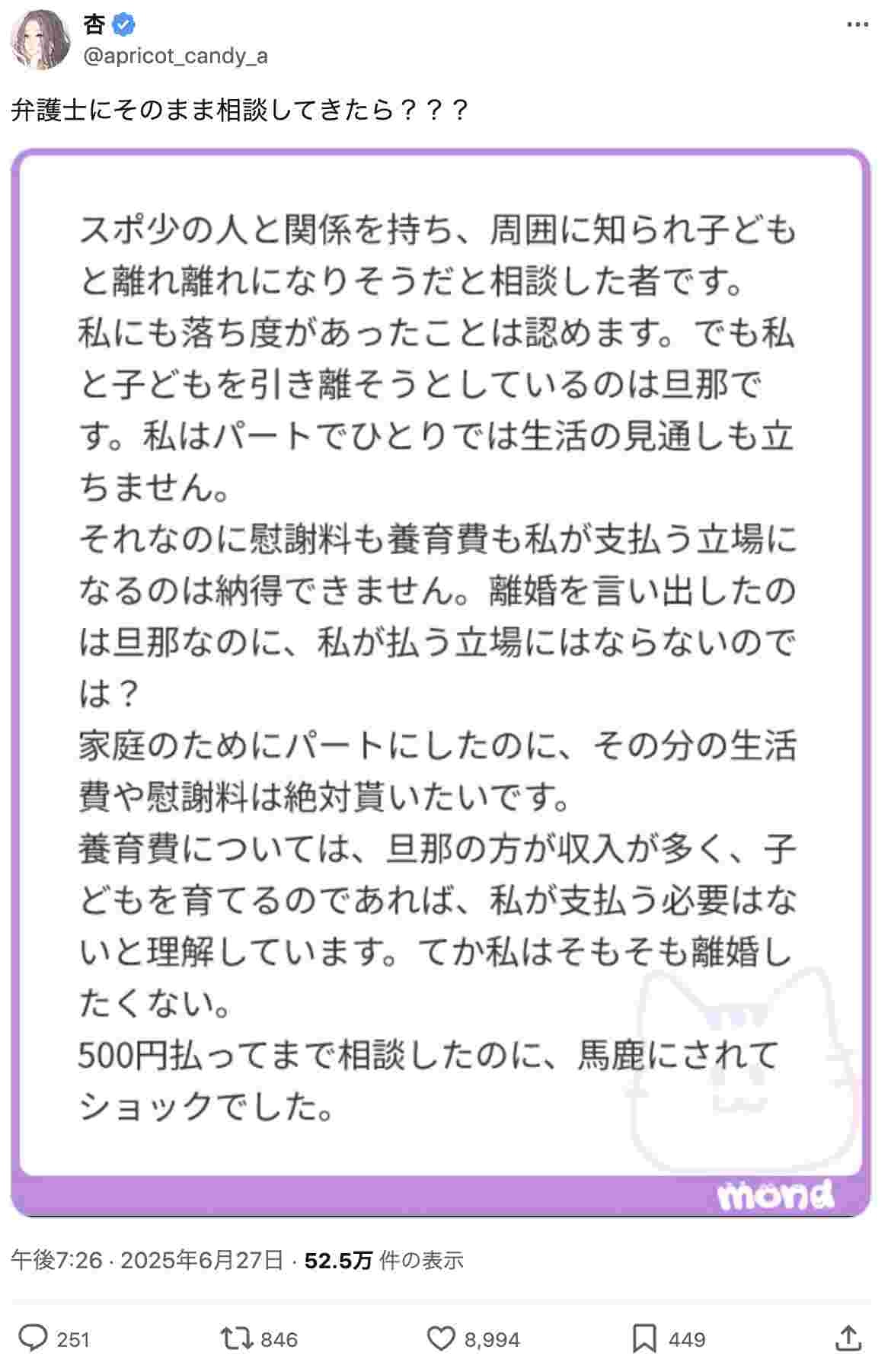 まぁ勝手に500円払って自業自得の相談投げつけてるんだしこの回答で十分じゃね - 57 名前:ここからは表現の自由でイカせていただきます 投稿日時:2025/06/28(土) 15:22:24.660 ID:pd0AvIuj0